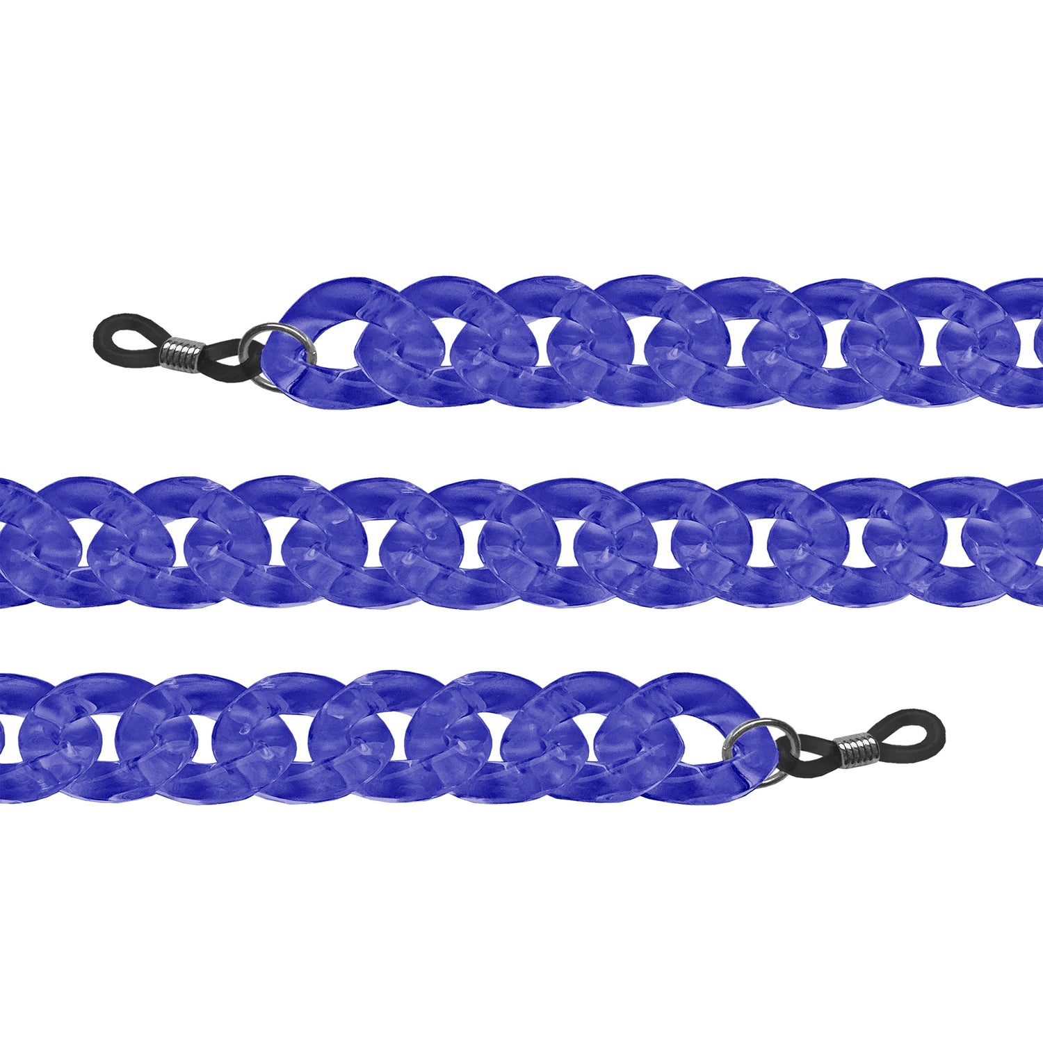 Blue glasses chain with attractive oversized links and a glossy finish. Adjustable loops attach to the temples of any glasses allowing them to hang around the neck and put them right where you need them!