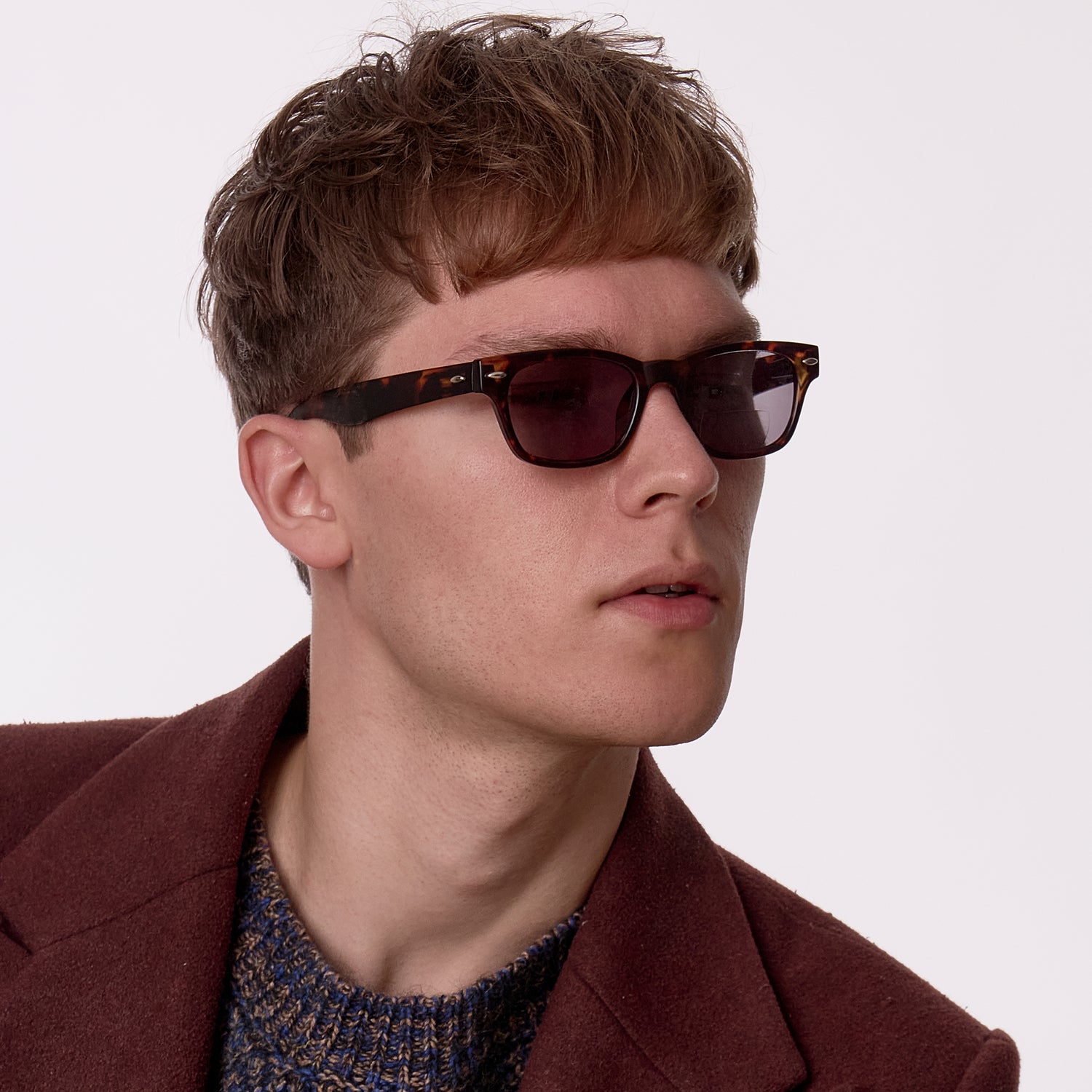 Matt tortoiseshell bifocal reading sunglasses from German brand I Need You with smart retro look. The tinted lenses feature the reading strength in a lower segment while the upper portion is clear/without correction. These glasses provide category 2 full UV400 sun protection, suitable for medium strength sunlight. The frame has rivet detailing and spring hinges for added fit and comfort. A matching grey felt soft pouch is also included.